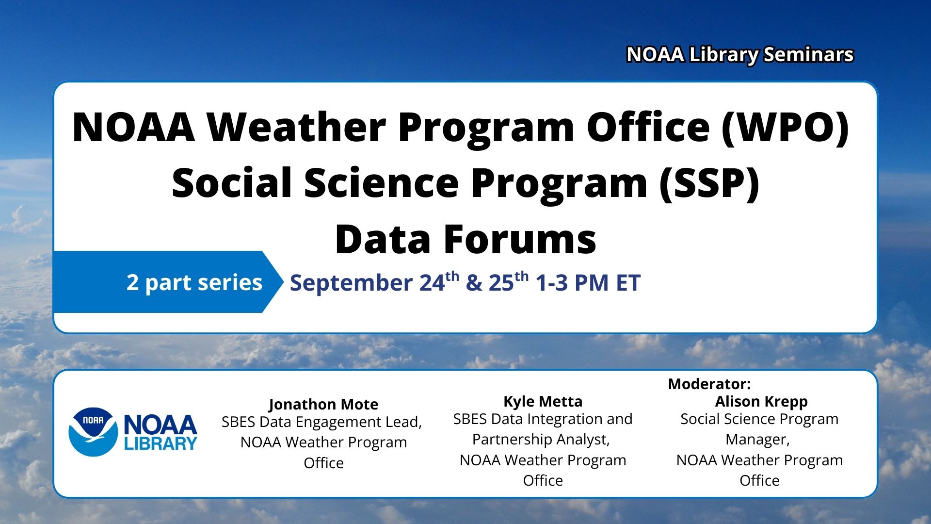 Abstract: The NOAA Weather Program Office (WPO) Social Science Program (SSP) is excited to announce a two-part virtual series, Data Forums, designed to help social science researchers explore the role of their data in the broader weather and hazards research ecosystem. These sessions will introduce practical tools, such as Jupyter notebooks, spark conversation about data sharing, and provide a starting point for future collaboration and integration.