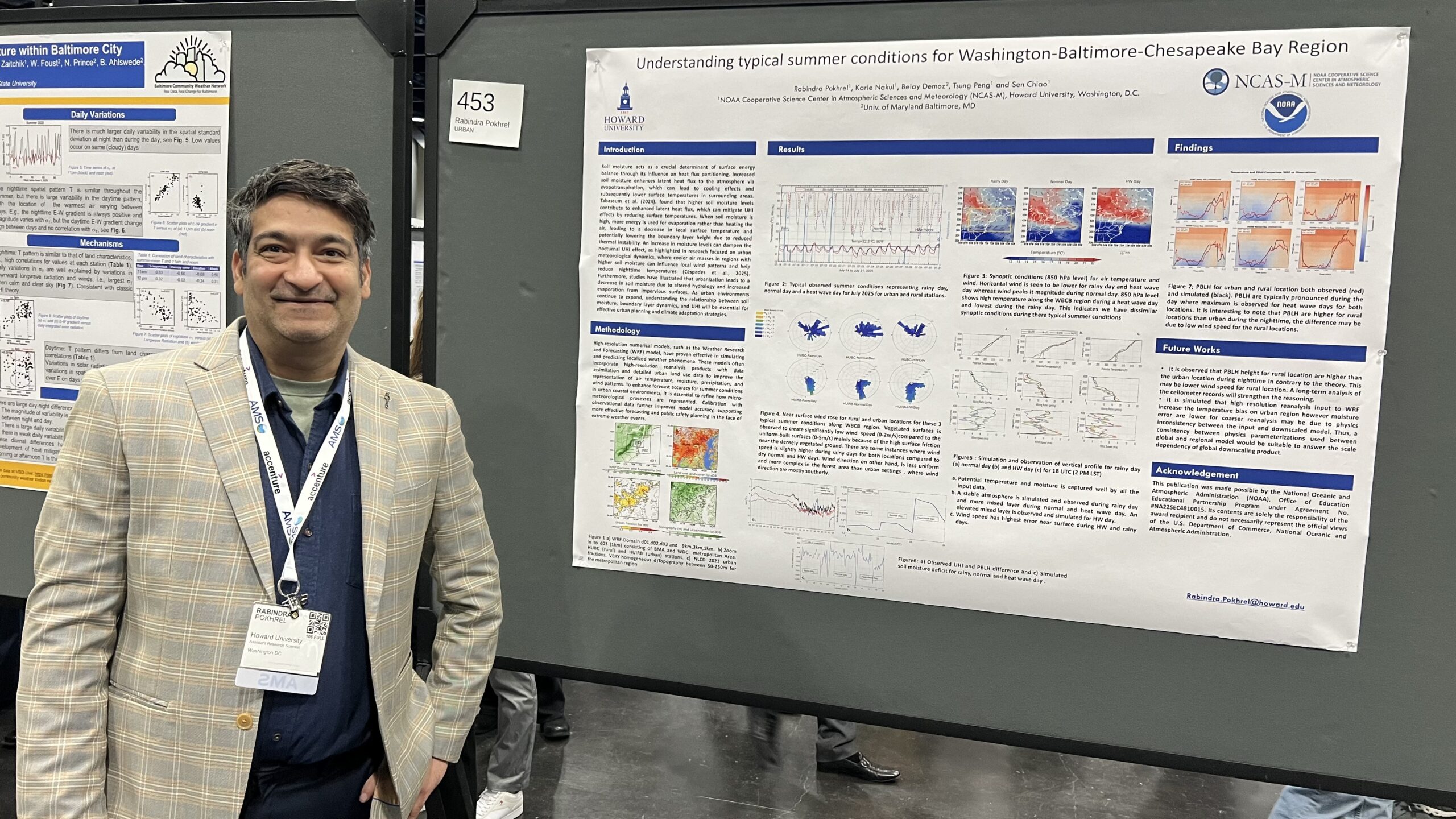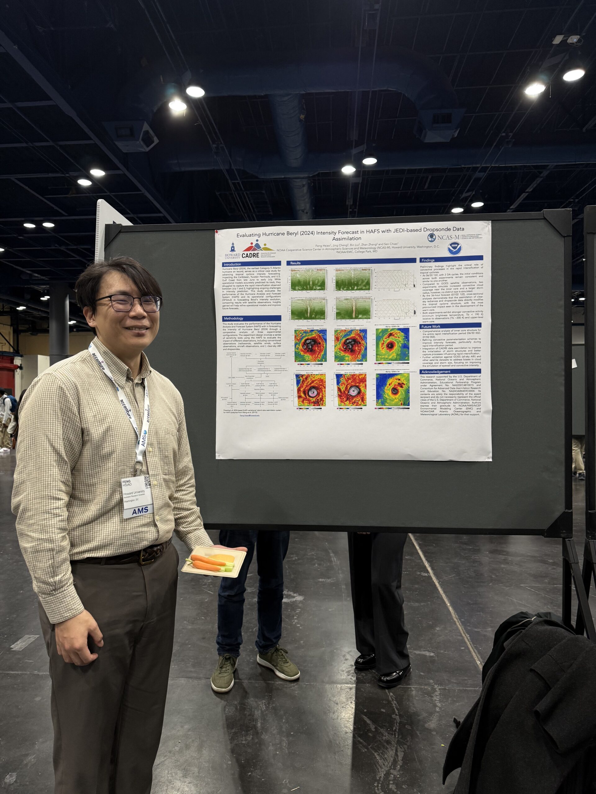 Oscar Chimborazo, Assistant Research Scientist at Howard University, presented a poster on using Convolutional Neural Networks to improve quantitative precipitation estimation from the Multi-Radar Multi-Sensor system. “The highlight was presenting my poster and sharing my research at the conference,” Chimborazo said. “It was valuable to see the rapid growth of AI-enabled techniques—not only for radar-based precipitation estimation, but also across many related topics.”